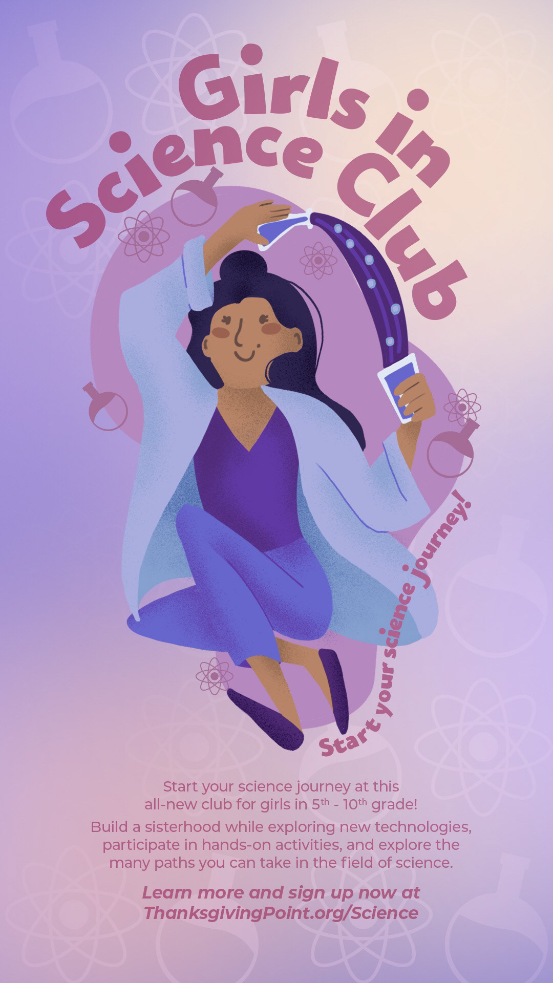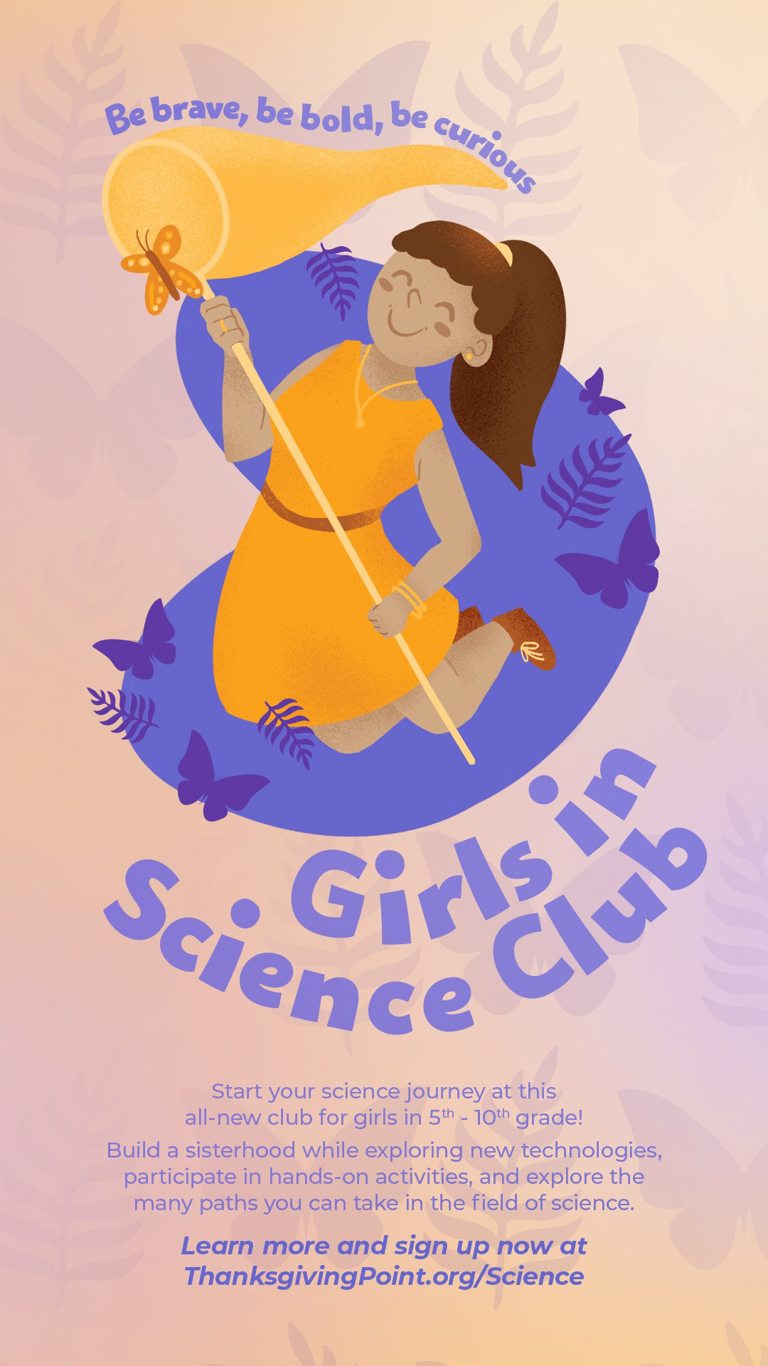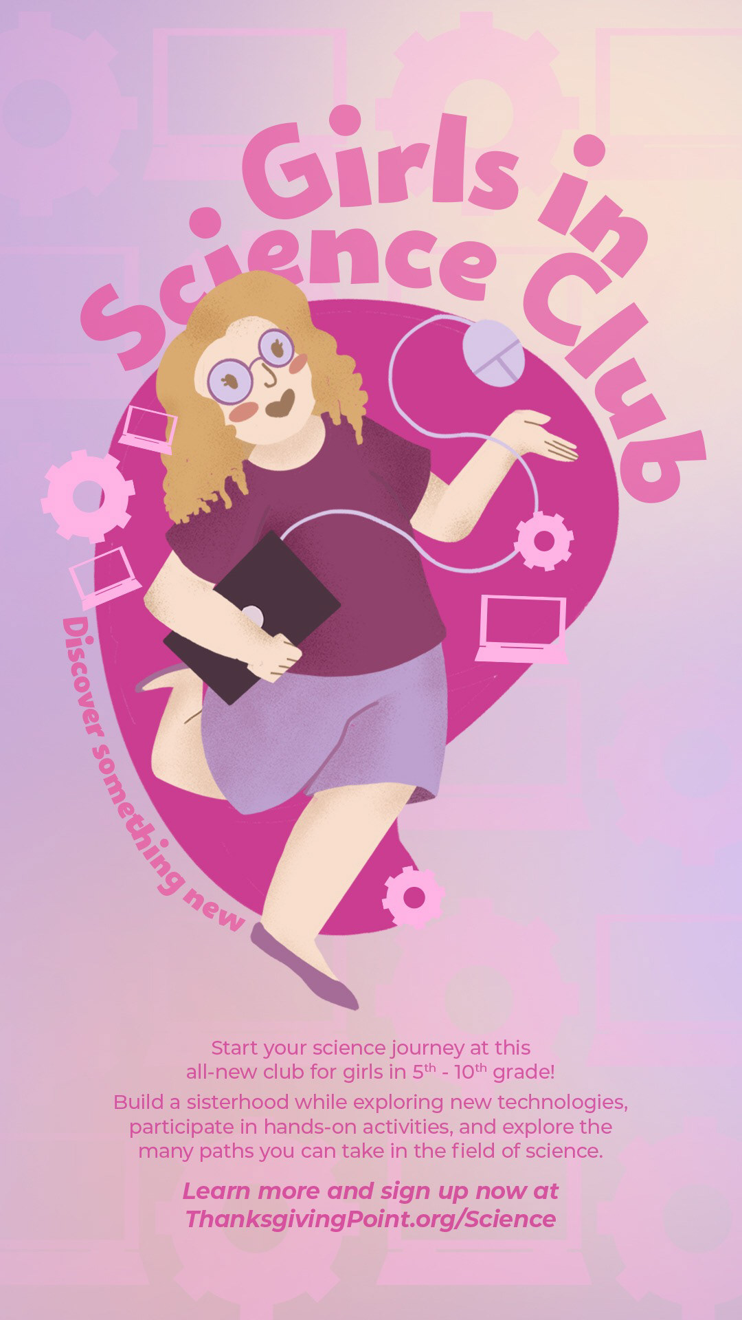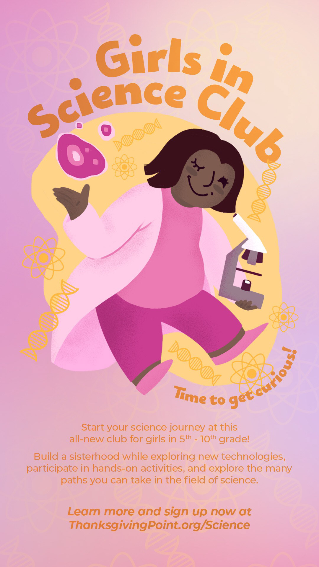 THANKSGIVING POINT CLUB: Branding for Girls in STEM club, the initial concept was more technical focused, sharp, shape driven illustration with a focus on diversity. The final was more organically driven with more focus on people engaging with science.